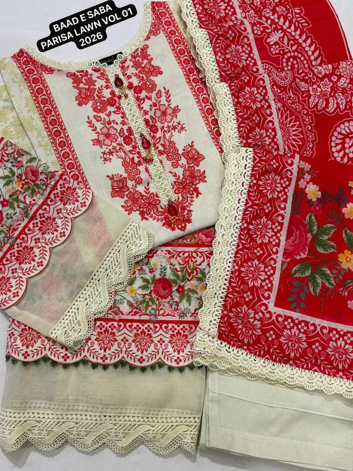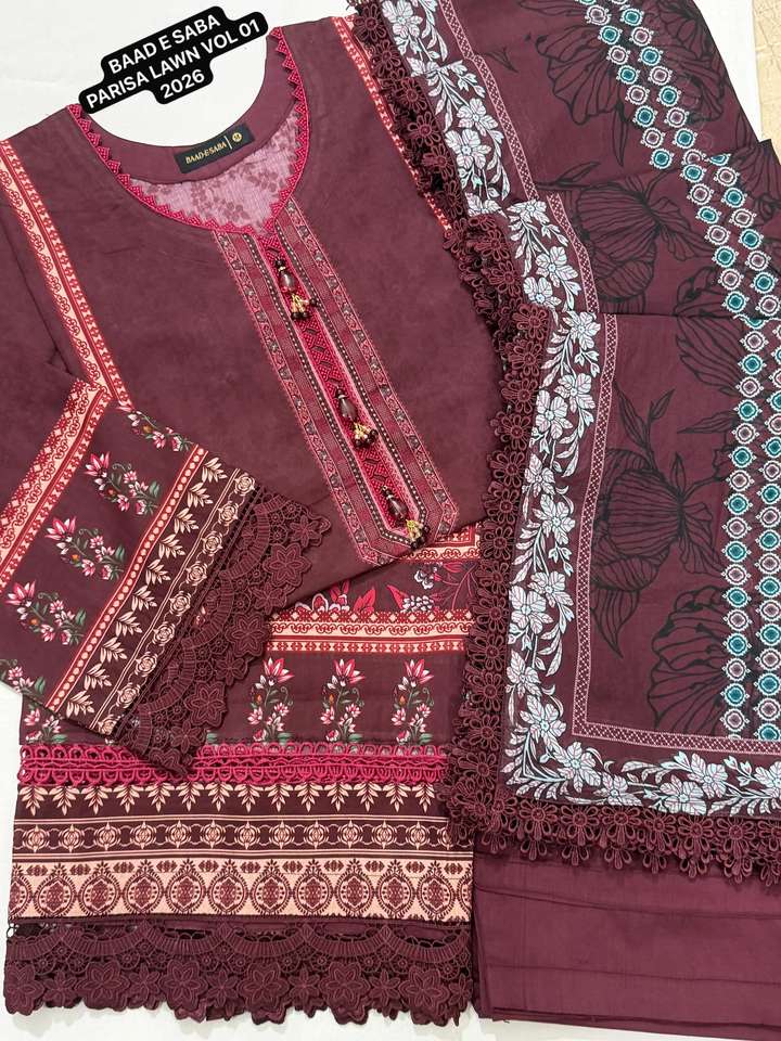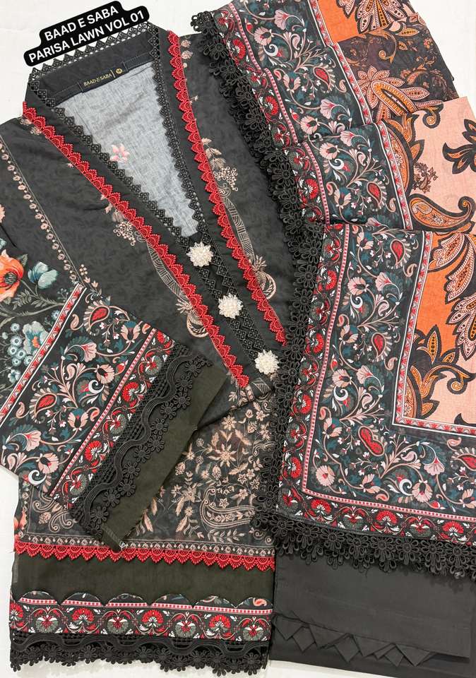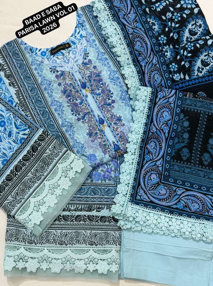 BAAD E SABA PARISA PARISA LAWN VOL-01, Camicia in lawn stampata digitalmente con pizzi e decorazioni, 3 pezzi cuciti, Collezione 2026