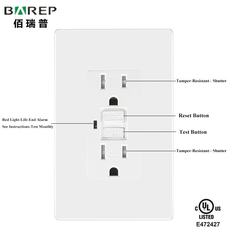 Presa a Muro GFCI BAREP BAS-004 15A 125V (TR) con 2 Uscite, Certificata CULus per 6000 Cicli di Vita, Uso Residenziale