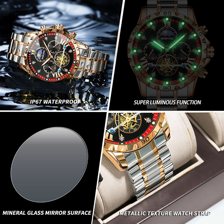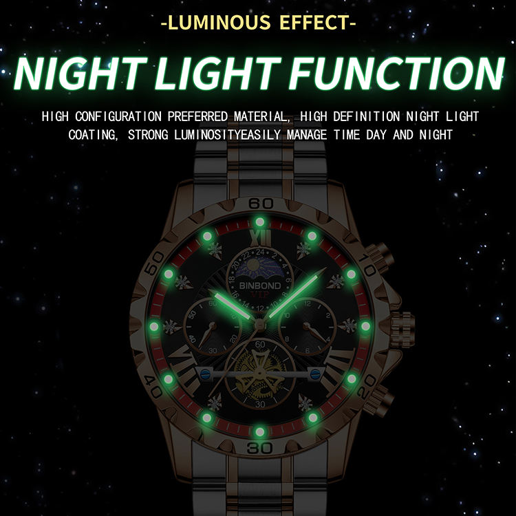BINBOND Men's Watch Genuine Business Student Luminous 30M Water Resistant Stainless Steel Flywheel Quartz High-end Cross-border