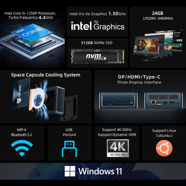 Mini PC BMAX B9 Plus 11, 24GB+512GB, Core I5-1250P, Supporta Uscita per 3 Monitor