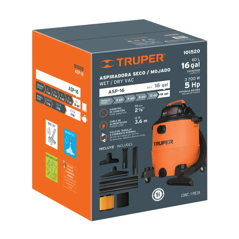 Aspirapolvere per Solidi e Liquidi BOX 1, 16 galloni, Plastica, TRUPER
