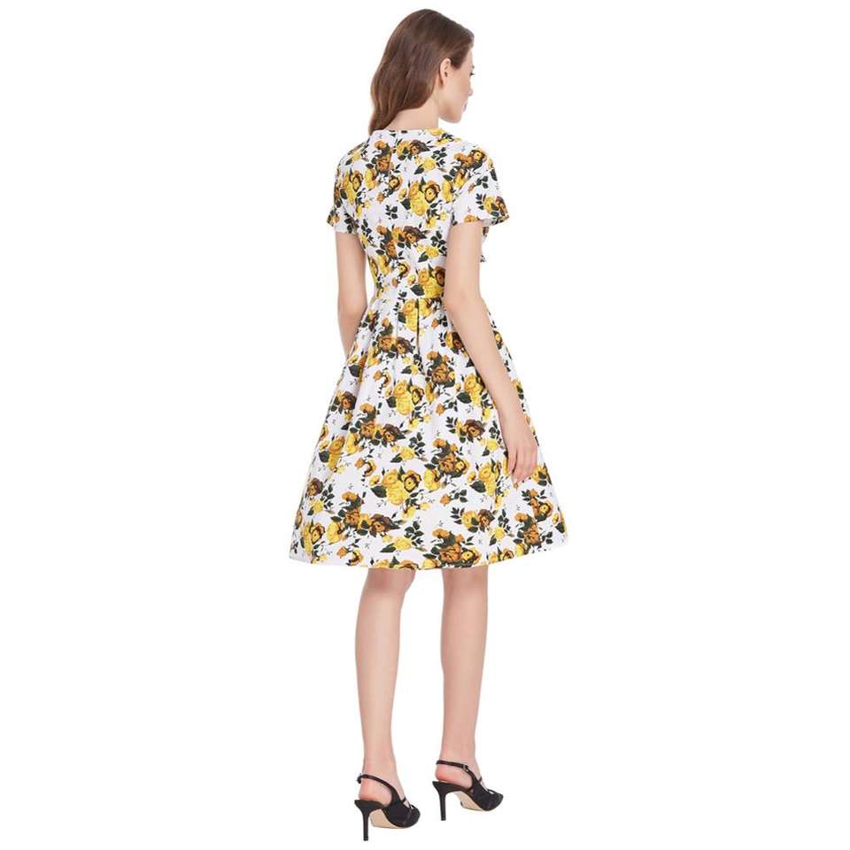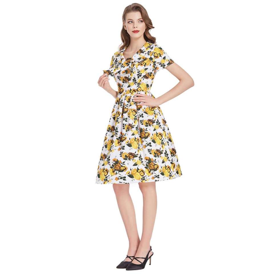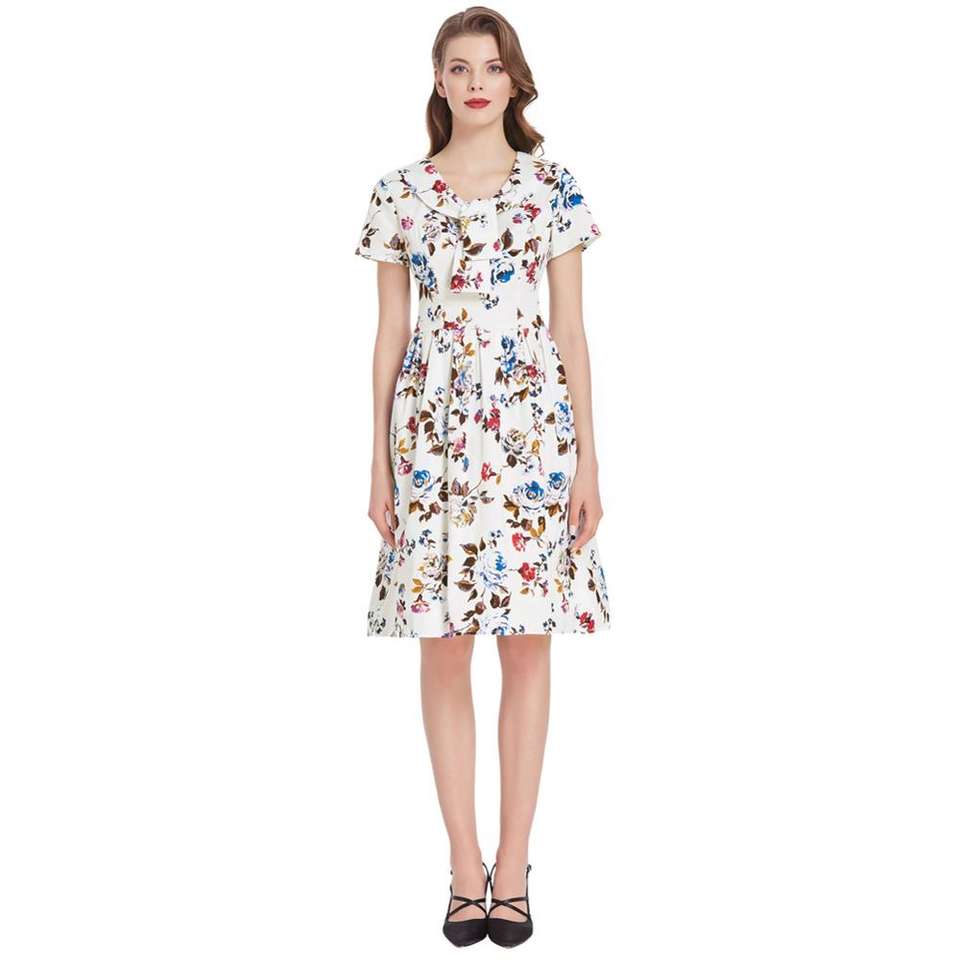 BPS02119 Womens 2020 New Tie Neck Dress Cotton Short Sleeve Pleated A-Line Floral Pattern Vintage Printed Dresses