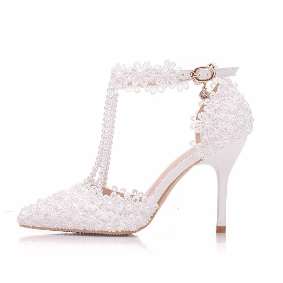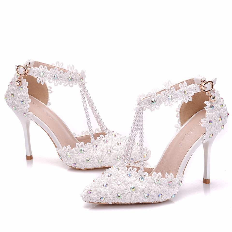 BS060 Scarpe da Sposa Bianche con Fiore in Pizzo 9cm, Sandali da Donna con Cinturino alla Caviglia, Scarpe a Stiletto a Punta
