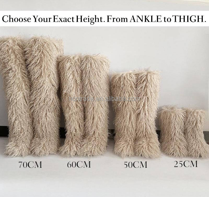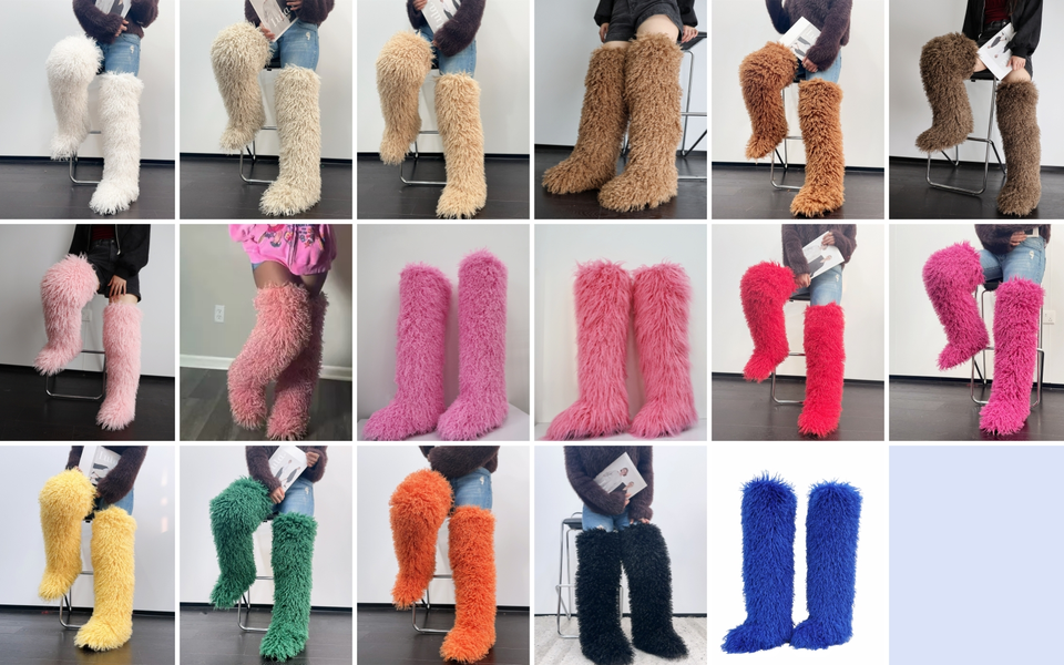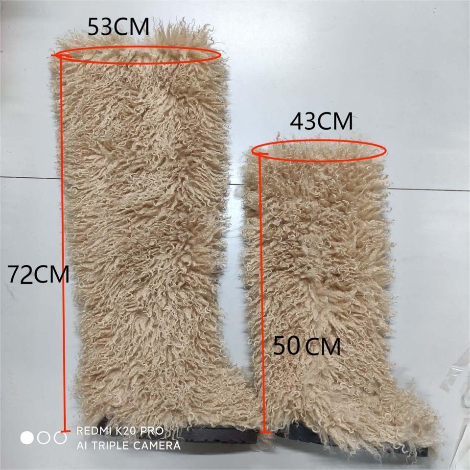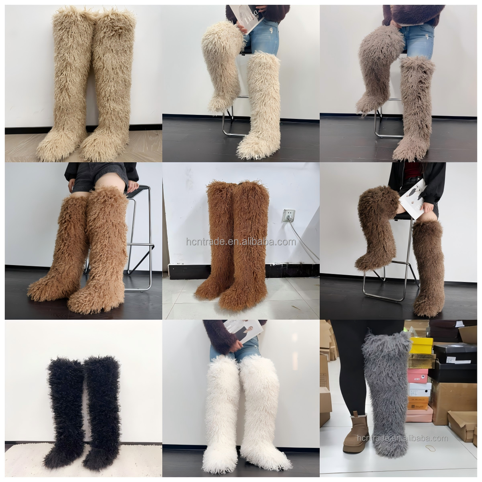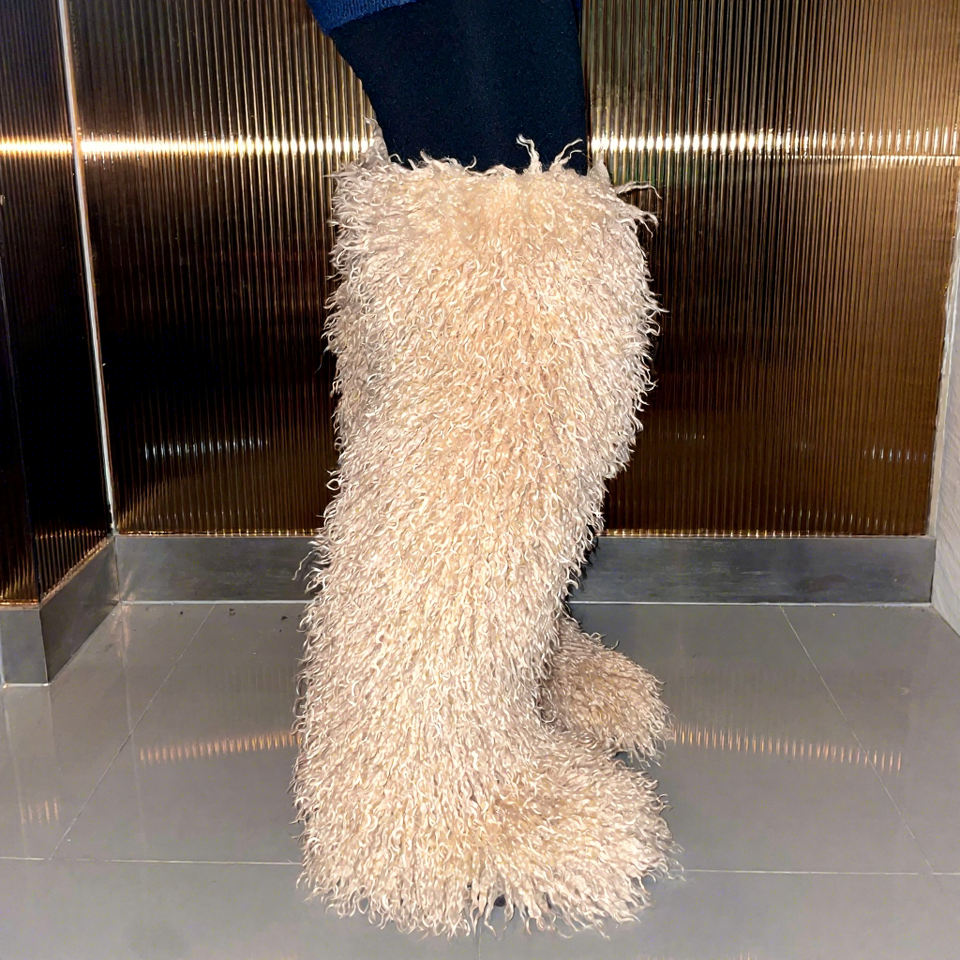 BUSY GIRL RS4735 Women Thigh High Boots with Fur Thick Leg Friendly Size 13 Flat Fluffy Fuzzy Faux Long Mongolian Fur Boots