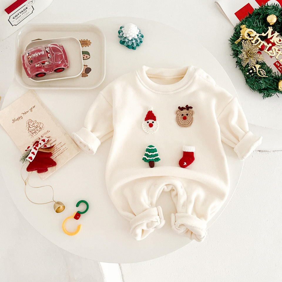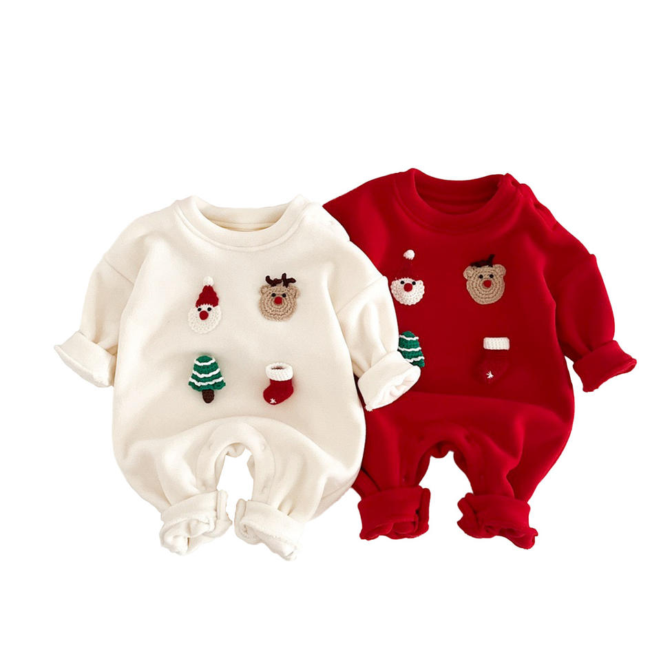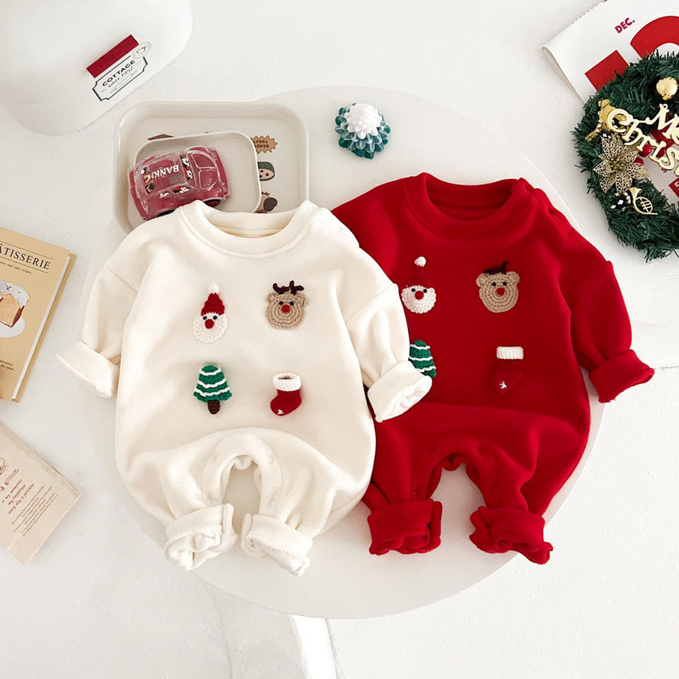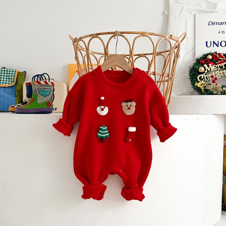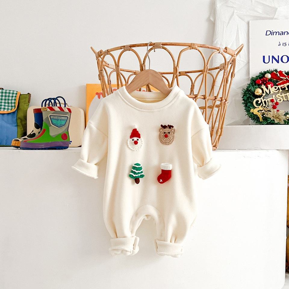 Pagliaccetto natalizio per neonati con applicazioni 3D a forma di cartone animato, tuta intera a maniche lunghe in morbido pile invernale per neonati
