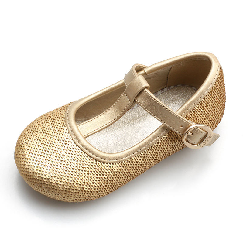 Baby Cute Soft Gold Sequin Upper with T bar Strap Buckle Round Popular Toe Gold Leather Soft Pu Flat Ballets