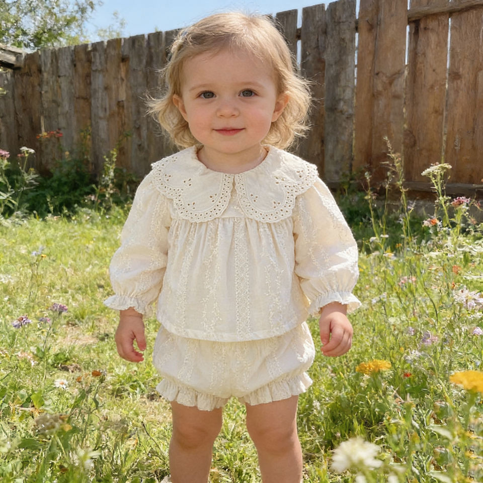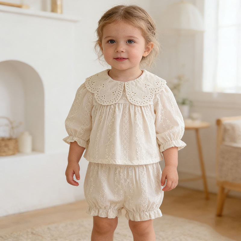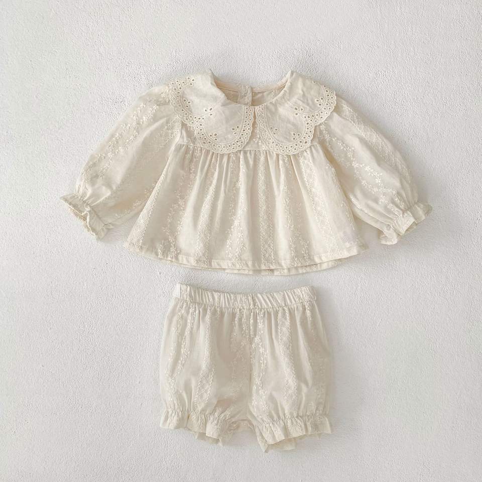 Completo estivo casual da principessa per bambina, 2 pezzi, con ricamo in pizzo, colletto Peter Pan vintage, top a maniche lunghe e pantaloncini con volant.