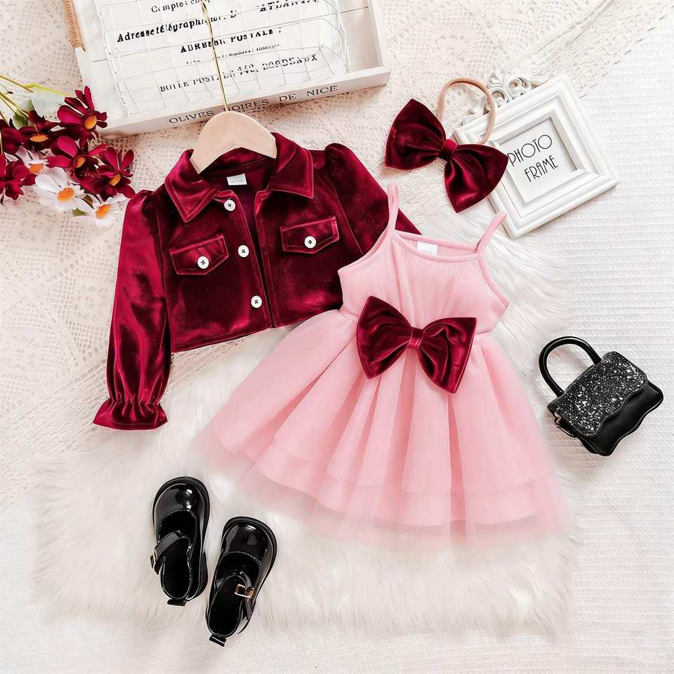 Baby Girl Velvet Wine Red Jacket Mesh Bow Strap Skirt Spring and Autumn Two Piece Set with Hair Accessories