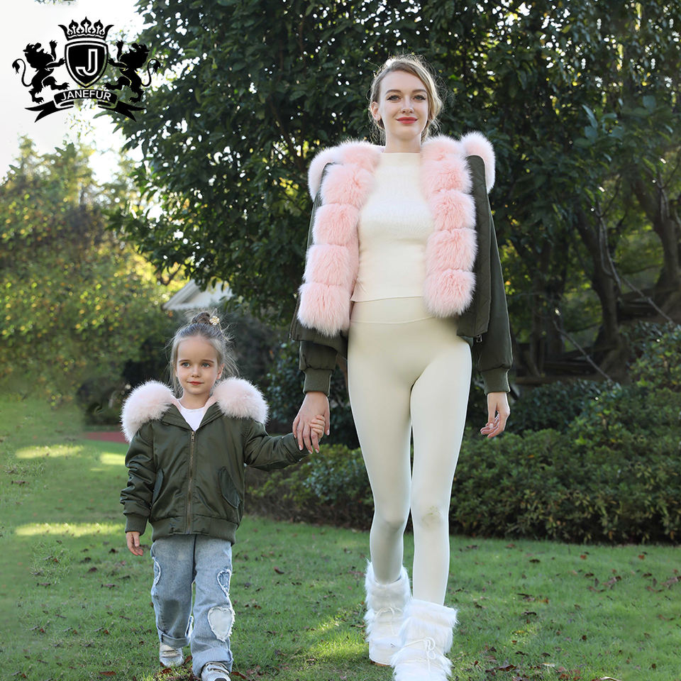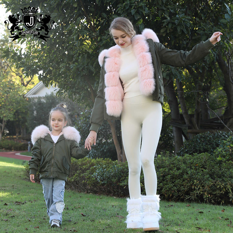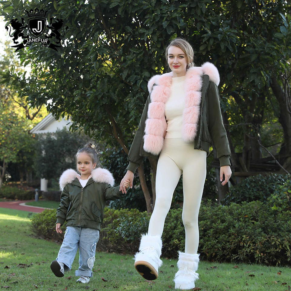 Cappotti con cappuccio in pelliccia invernale da bambina vestiti caldi Bomber antivento invernale per mamma e bambini