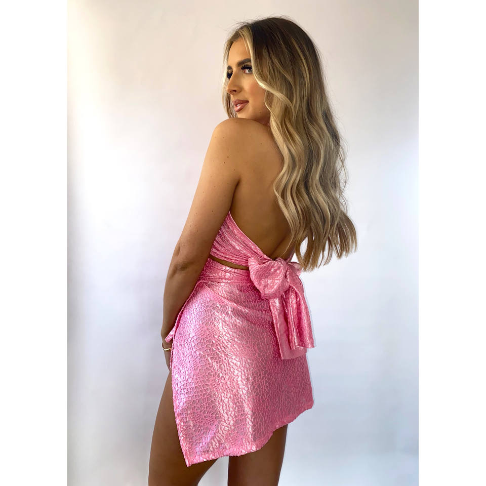 Baby rosa pelle di serpente criss cross top a fascia con fiocco