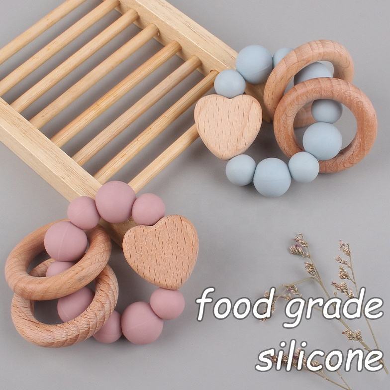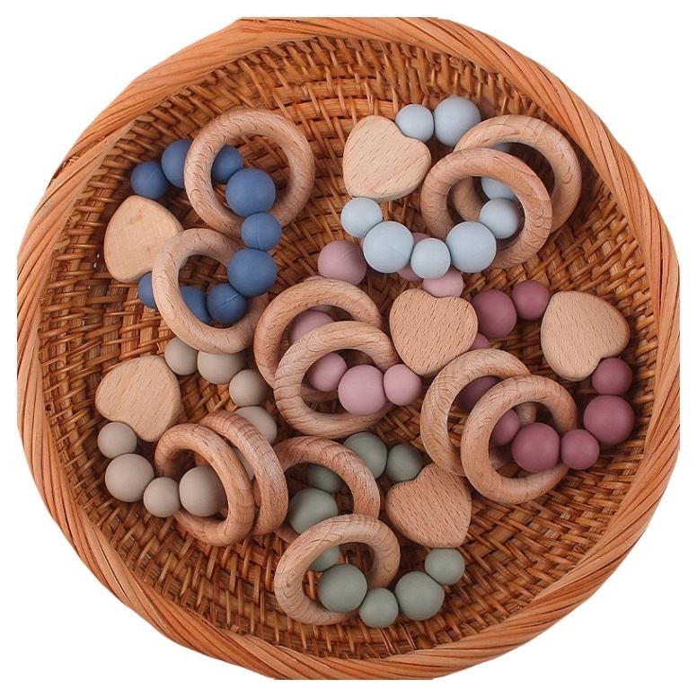 Giocattolo Sensoriale per Dentizione Neonati, Anello in Legno con Perline in Silicone Alimentare, Massaggiagengive per Neonati