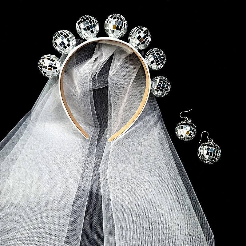 Set per Addio al Nubilato con Fascia per Capelli a Sfera Disco con Velo e Orecchini a Specchio Abbinati, Decorazioni per la Festa della Ultima Notte di Libertà