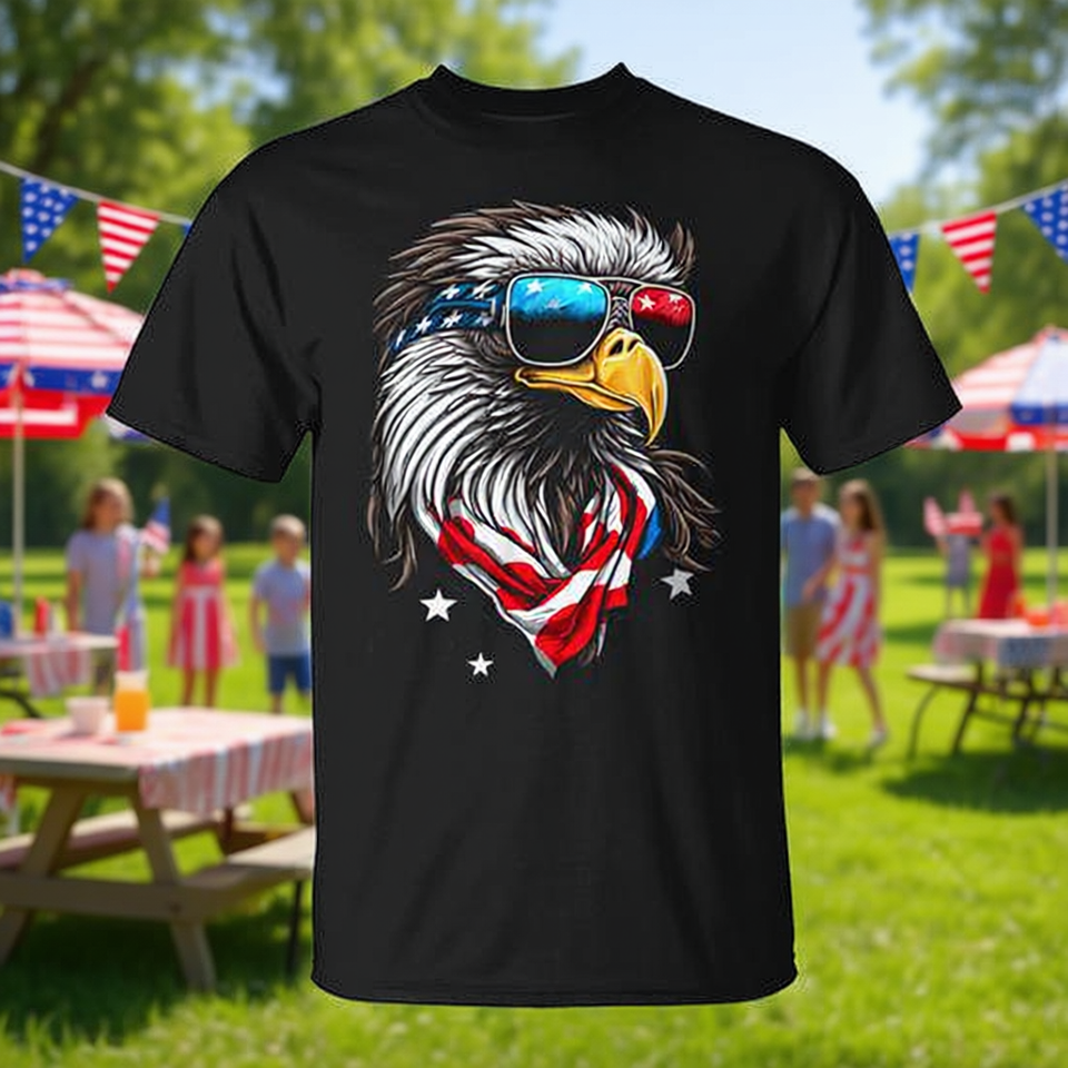 T-shirt unisex per adulti a maniche corte con stampa digitale Bald Eagle Mullet American Flag 4th of July