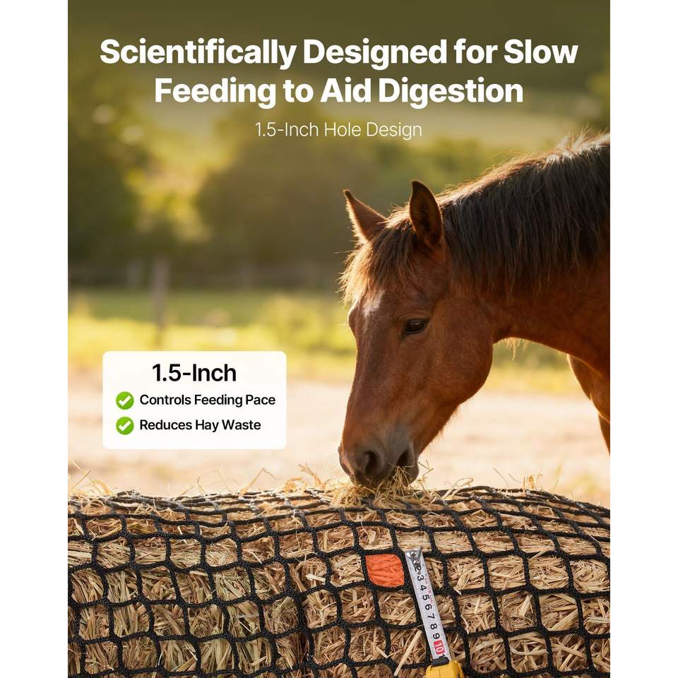 Rete per balle di fieno per la cura dei cavalli 5.91 x 5.91 x 5.91 piedi, fori da 1.5 pollici, materiale PE, design senza nodi con fascette a zip, riparazione con ago e navetta