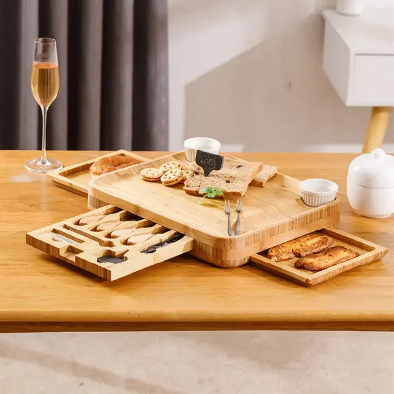 Set di vassoi per antipasti in bambù con coltelli per formaggio in acciaio inossidabile, utensili da taglio, lavaggio a mano consigliato, per uso domestico in cucina