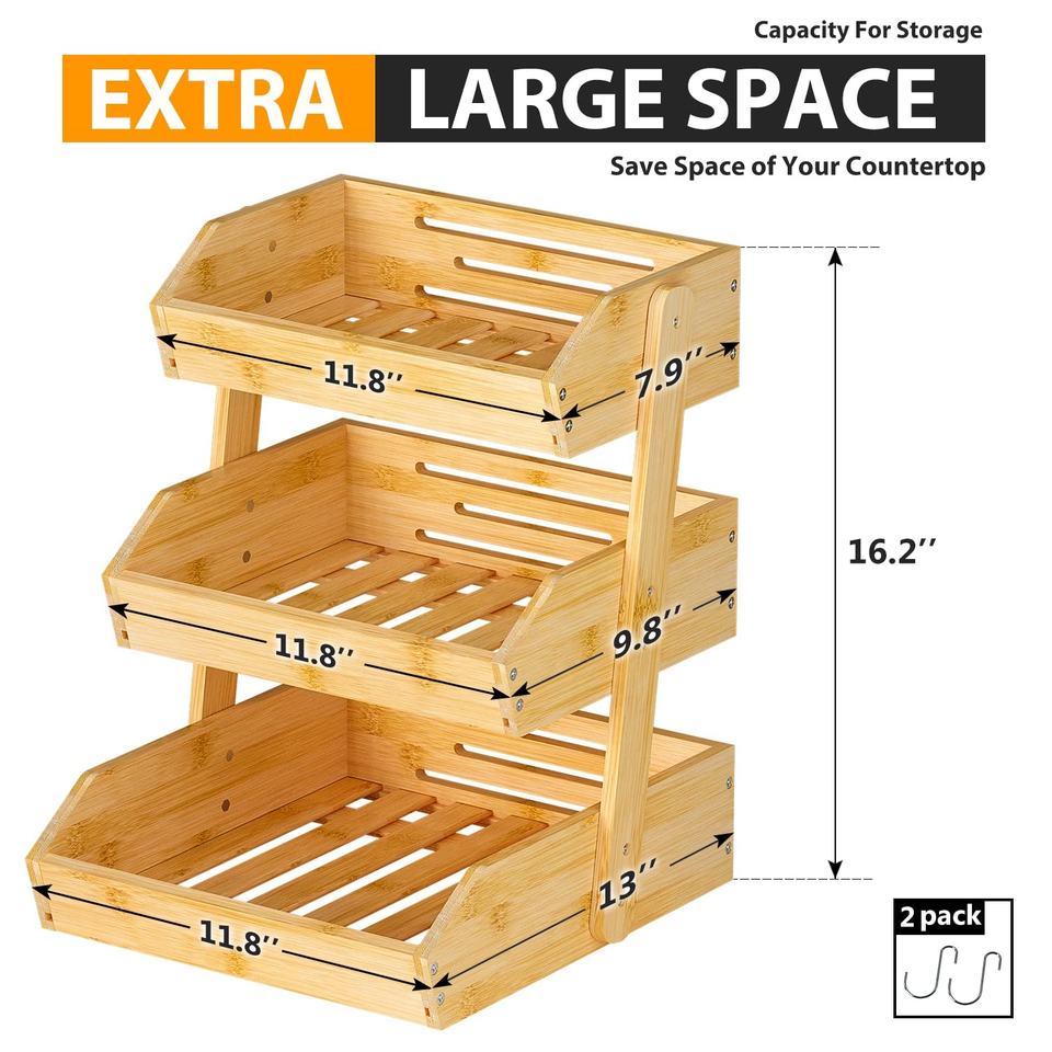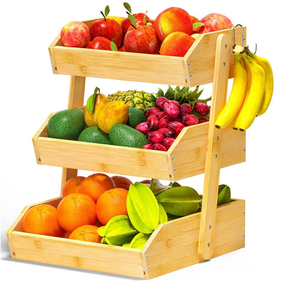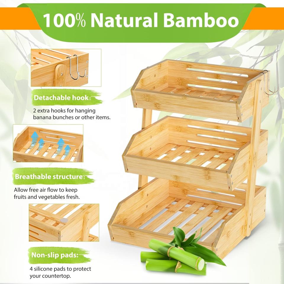 Cesto di frutta di bambù con 2 appendiabiti a Banana di bambù di grande capacità porta frutta a 3 livelli per bancone cucina
