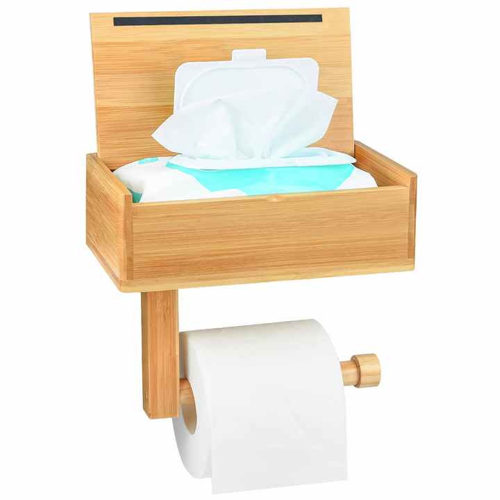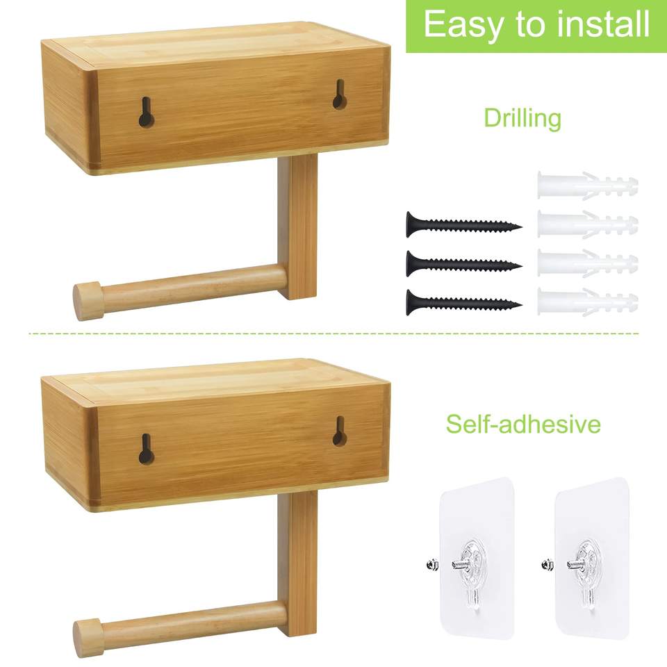 Bamboo Toilet Paper Holder Bathroom Wipes Organizer Dispenser Wood Wall Mount Adhesive Bathroom Tissue Roll Holder Storage Shelf