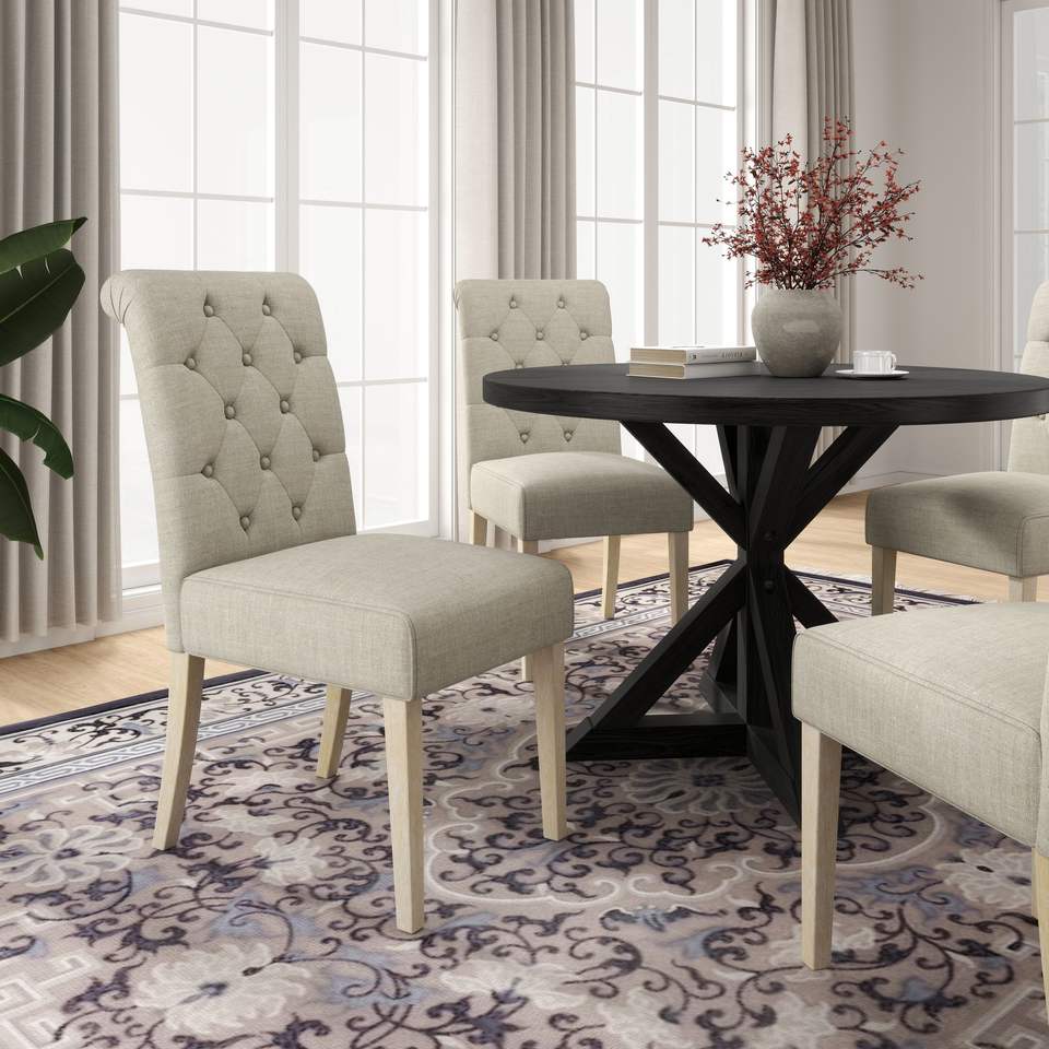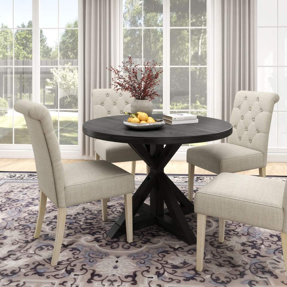Set da pranzo Banff da 5 pezzi con tavolo rotondo Cross Buck e 4 sedie trapuntate color marrone chiaro per la tua sala da pranzo