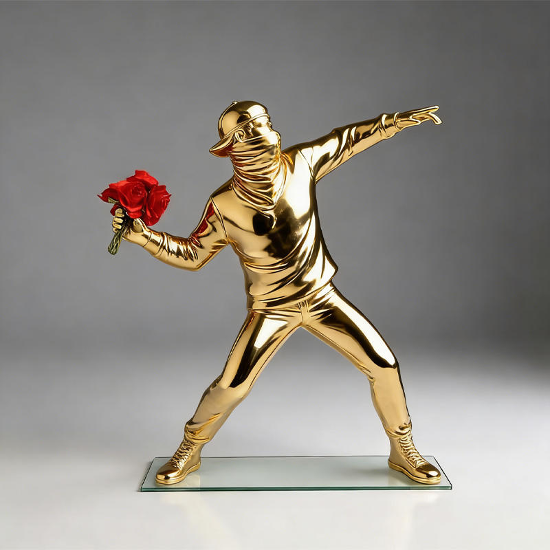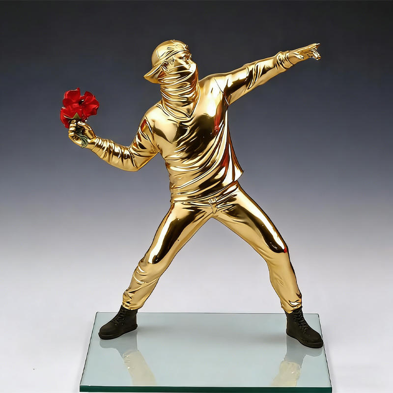 Statua in Resina Ispirata a Banksy, Moderna Lanciatrice di Fiori con Elettroplaccatura Audace