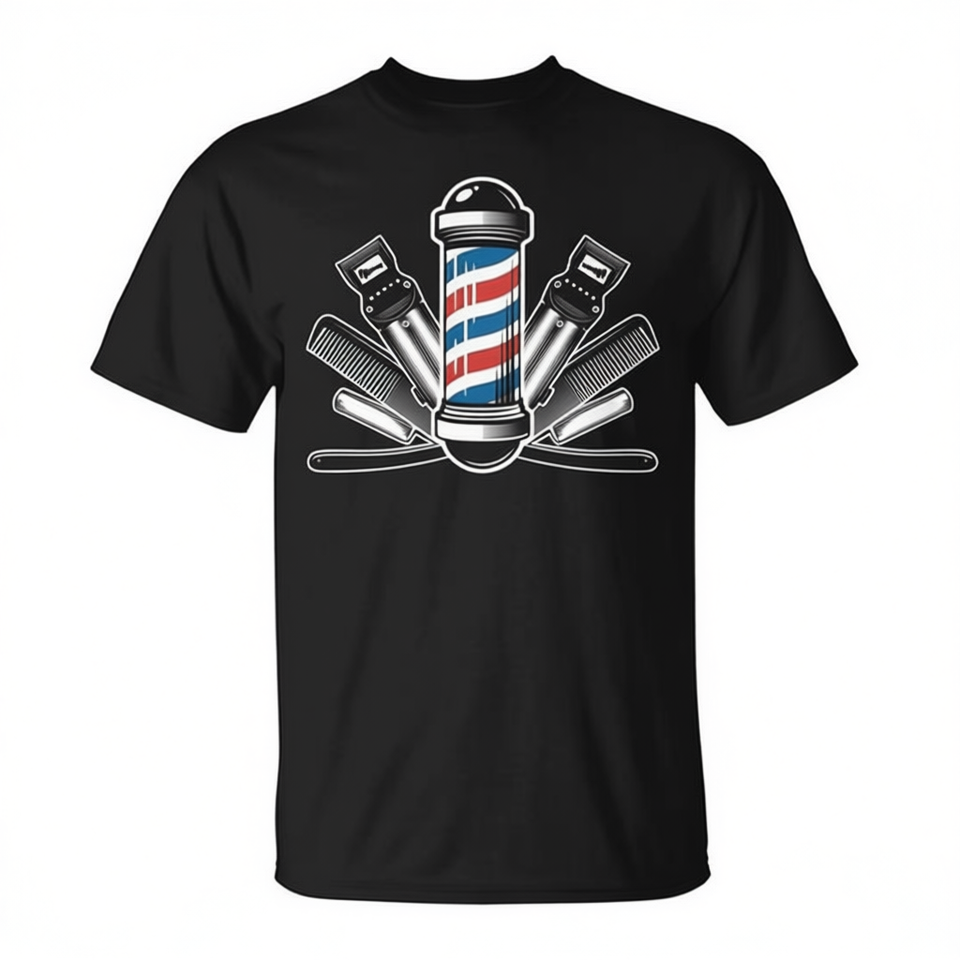 T-shirt da uomo con stampa serigrafica a tema barbiere, vestibilità classica, girocollo, manica corta, abbigliamento promozionale