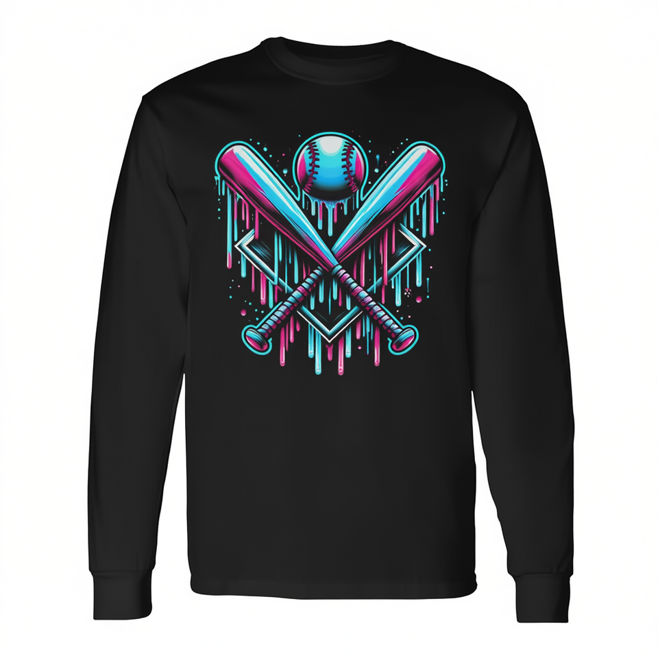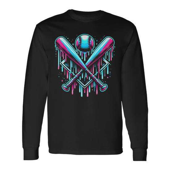 T-shirt a maniche lunghe Baseball Drip con design di mazze incrociate e palla per i fan dei giocatori