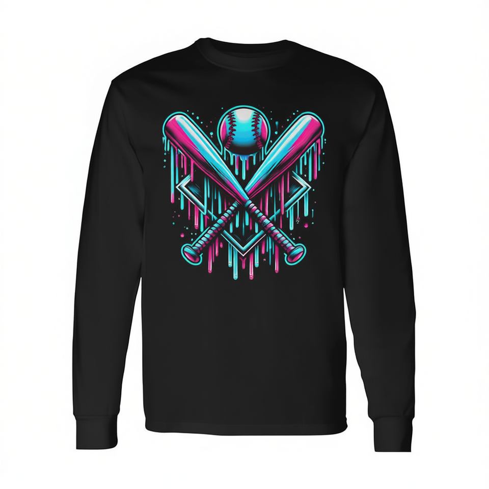 T-shirt a maniche lunghe Baseball Drip con design di mazze incrociate e palla per giocatori e tifosi