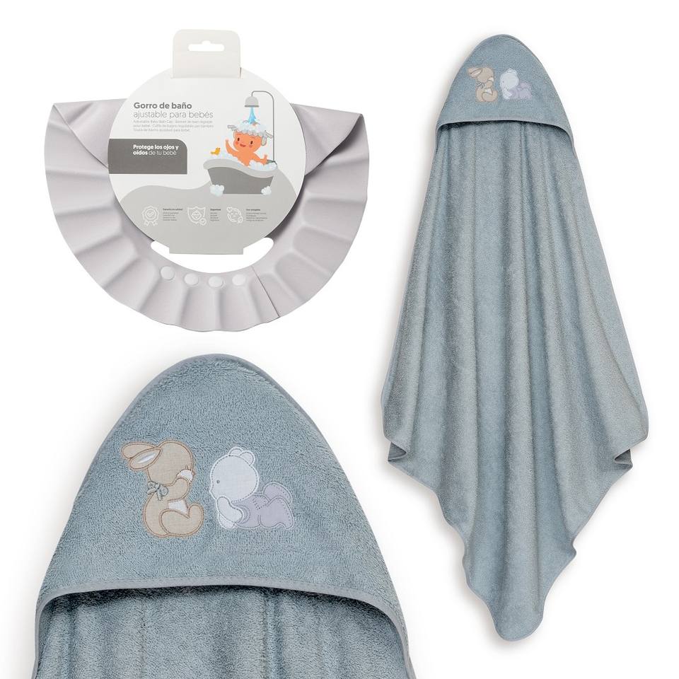 Set di Asciugamani da Bagno per Neonati 1X1 MT. Mod Osito Tumbado Conejito + Cappello in Spugna Grigio per Bagno