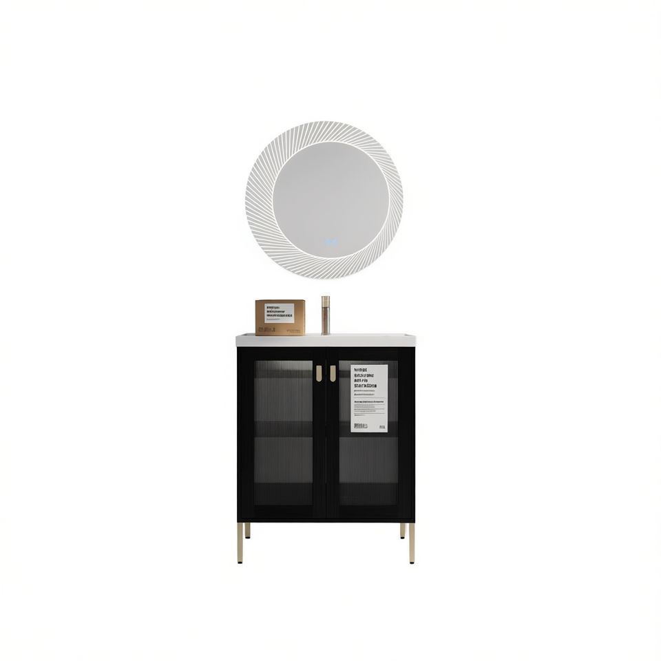 Mobile da Bagno 28 Pollici in Compensato con Lavabo in Ceramica, Ante a Chiusura Morbida, Design Moderno Minimalista, Specchio Incluso