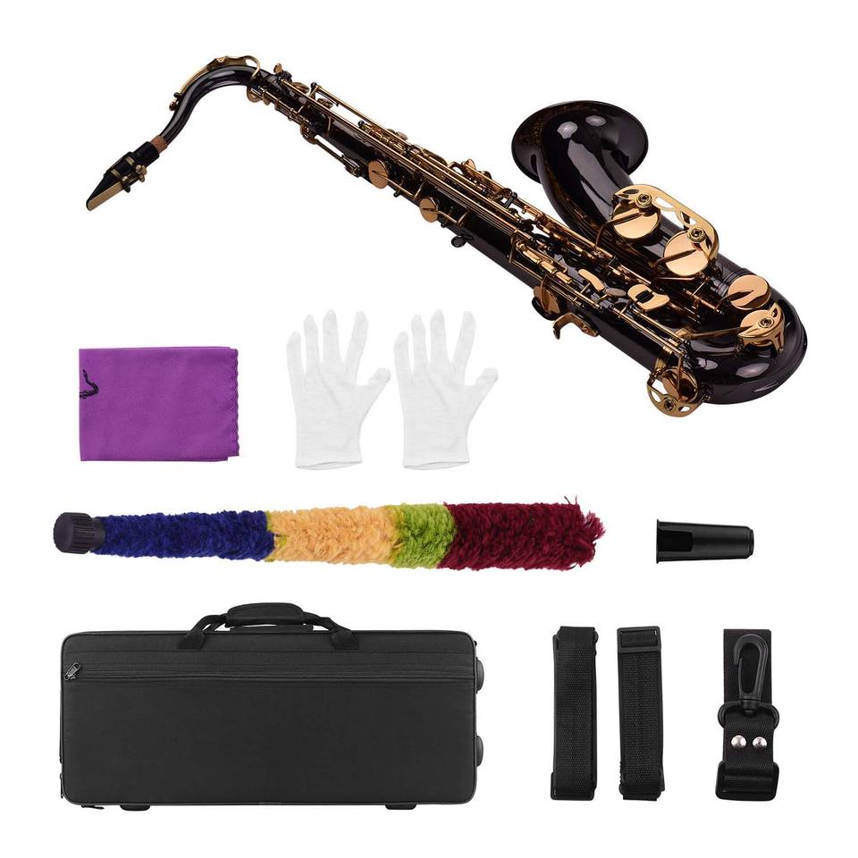 KW327 Sax tenore Sib (Bb), corpo ottone nichel nero, chiavi dorate intarsi bianchi, custodia imbottita e accessori, 1 pz