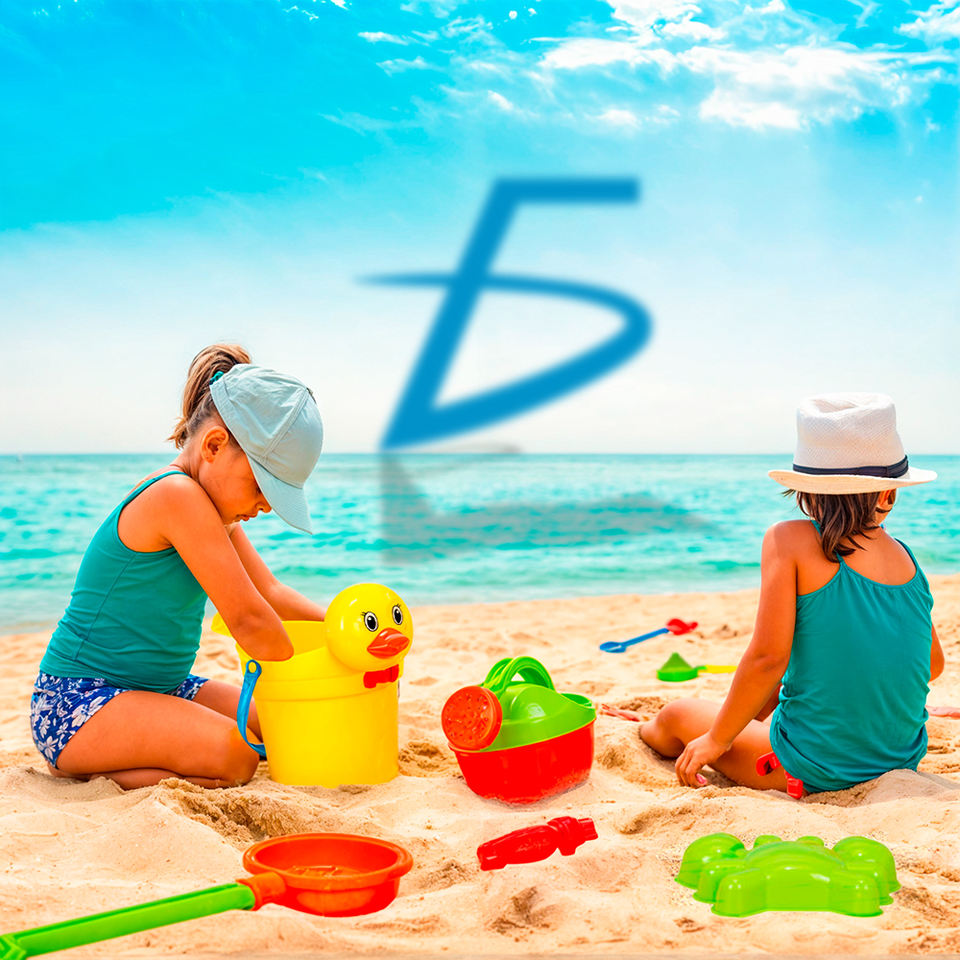 Set da spiaggia con secchiello anatra con 4 pale, annaffiatoio e due stampi