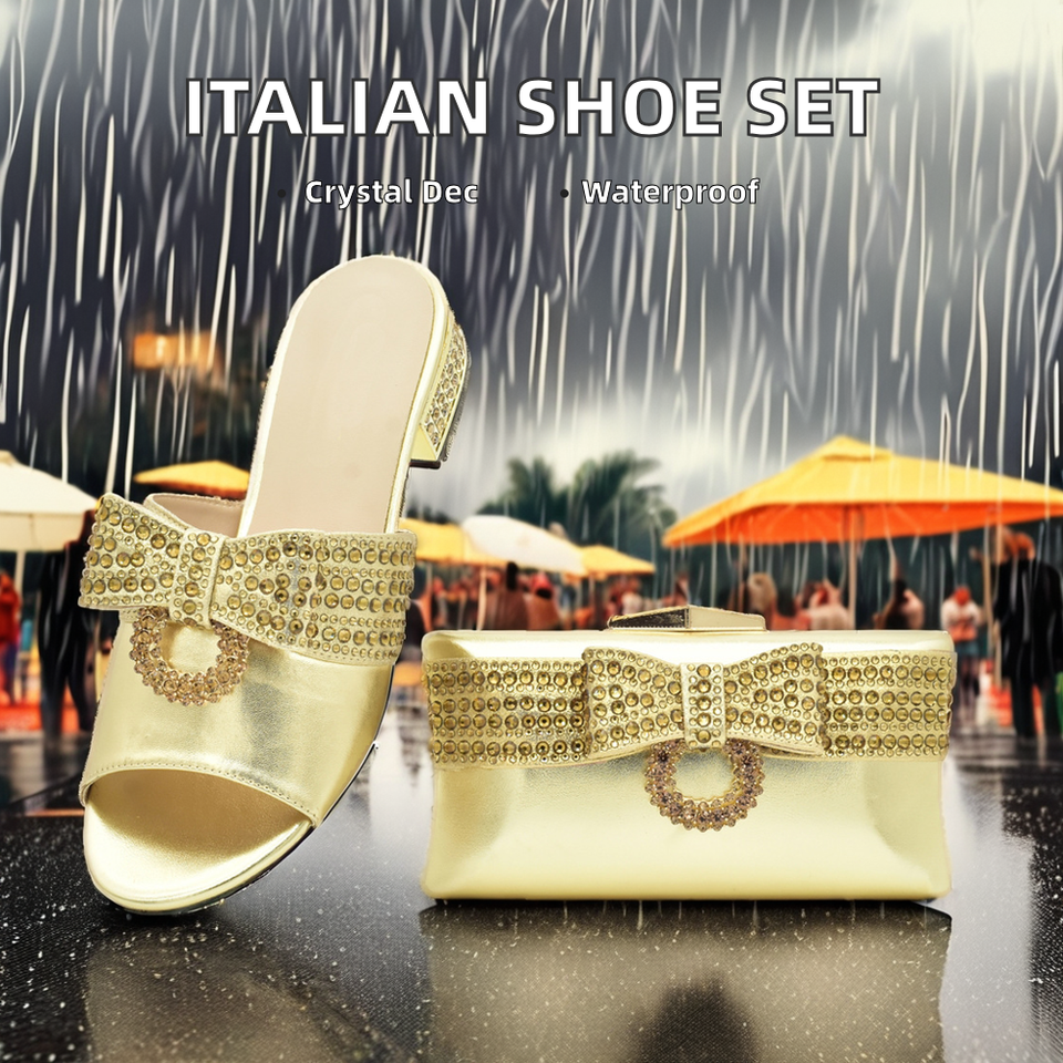 Bellissimo Set di Scarpe Italiane da Donna con Tacco Basso e Punta Aperta, Eleganti Ciabatte da Sposa e Borsa per Feste