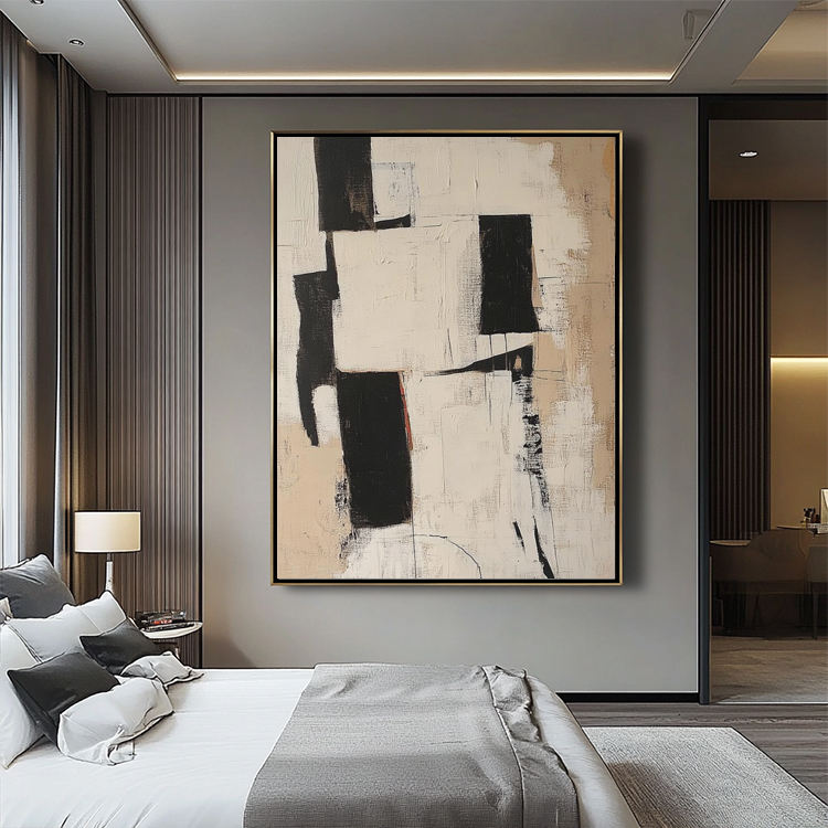 Hand working:Handmade Boho Mid Century Painting Beige Black Wabi Sabi Wall Art