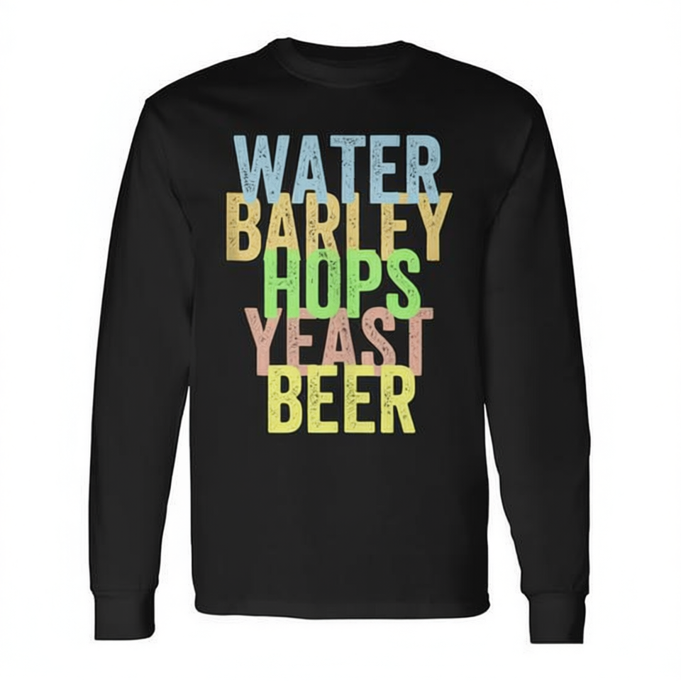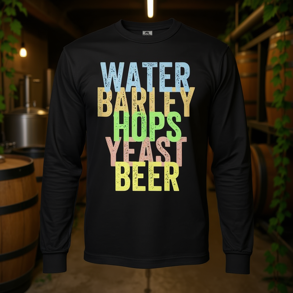 Ingredienti per la produzione della birra: acqua, orzo, luppolo, lievito, birrificio, birra, maglietta a maniche lunghe