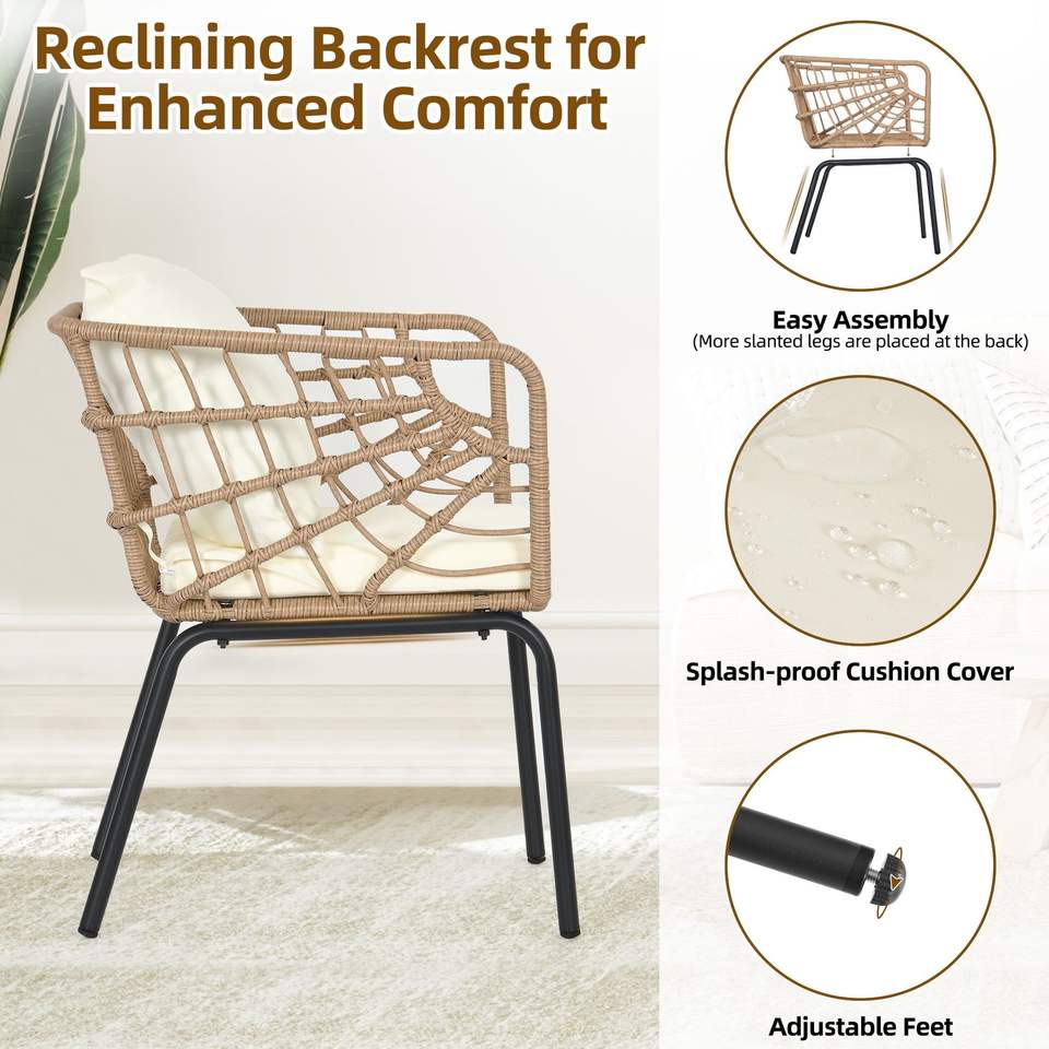 Beige 3-Piece Outdoor Patio Furniture Set Wicker Bistro with 2 Chairs Coffee Table Cushions Lumbar Pillows