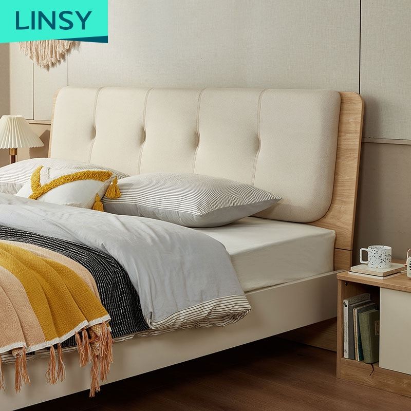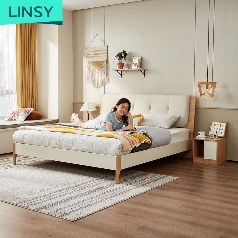 Letto Matrimoniale Moderno con Testiera in Pelle e Struttura in Legno Massello Beige per Uso Domestico CB1A-A
