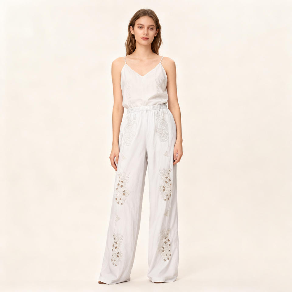 Beige Floral Embroidery Women's Casual Long Pants Elastic Waist Mid Waist Woven Fabric Full Length Breathable for Autumn Season