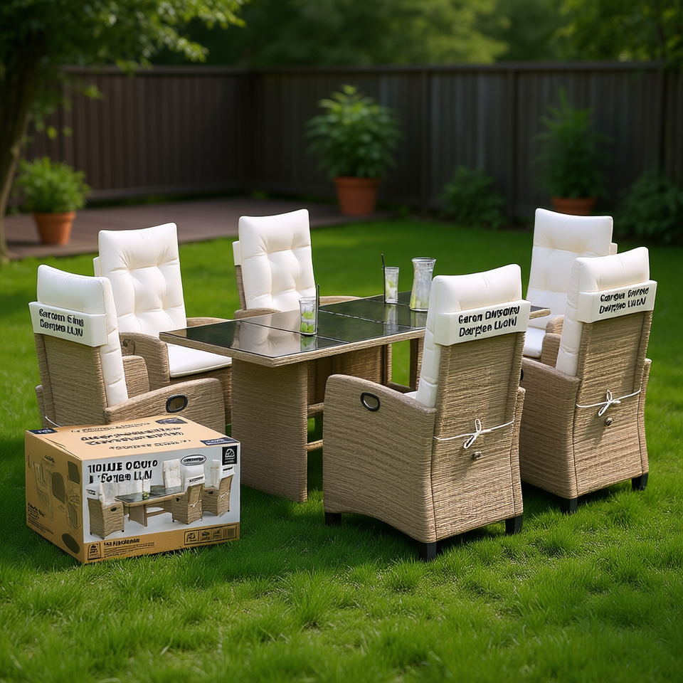Set da Pranzo da Giardino in Rattan Beige per 6 Persone, Resistente alle Intemperie, Arredamento da Esterno in Stile Contemporaneo