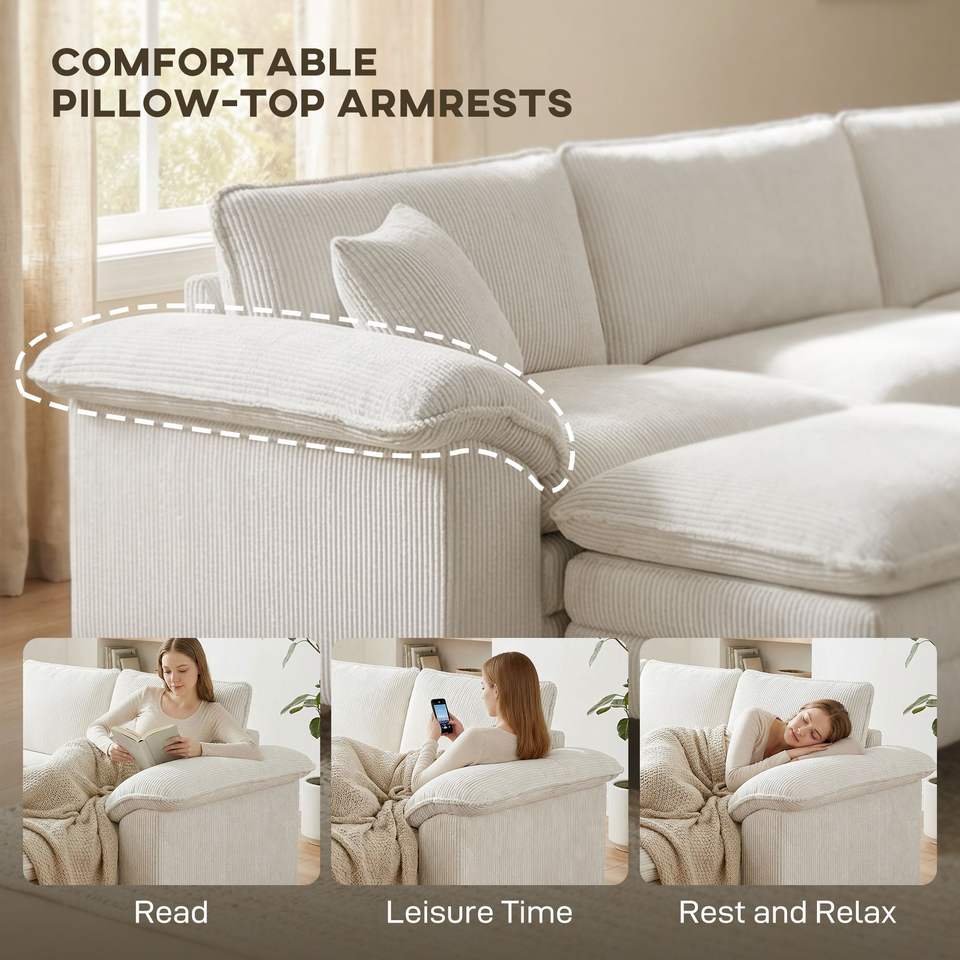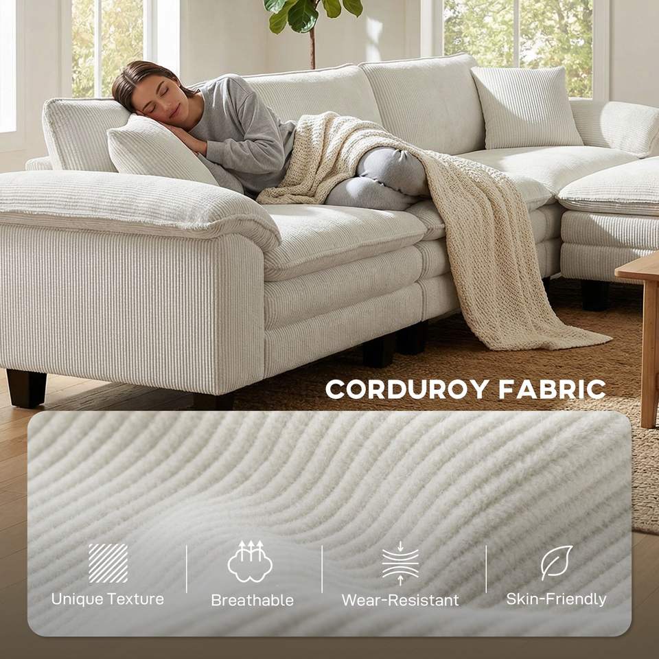 Divano Componibile a L Beige con Seduta Profonda, Pouf Mobile e Braccioli Imbottiti per Soggiorno