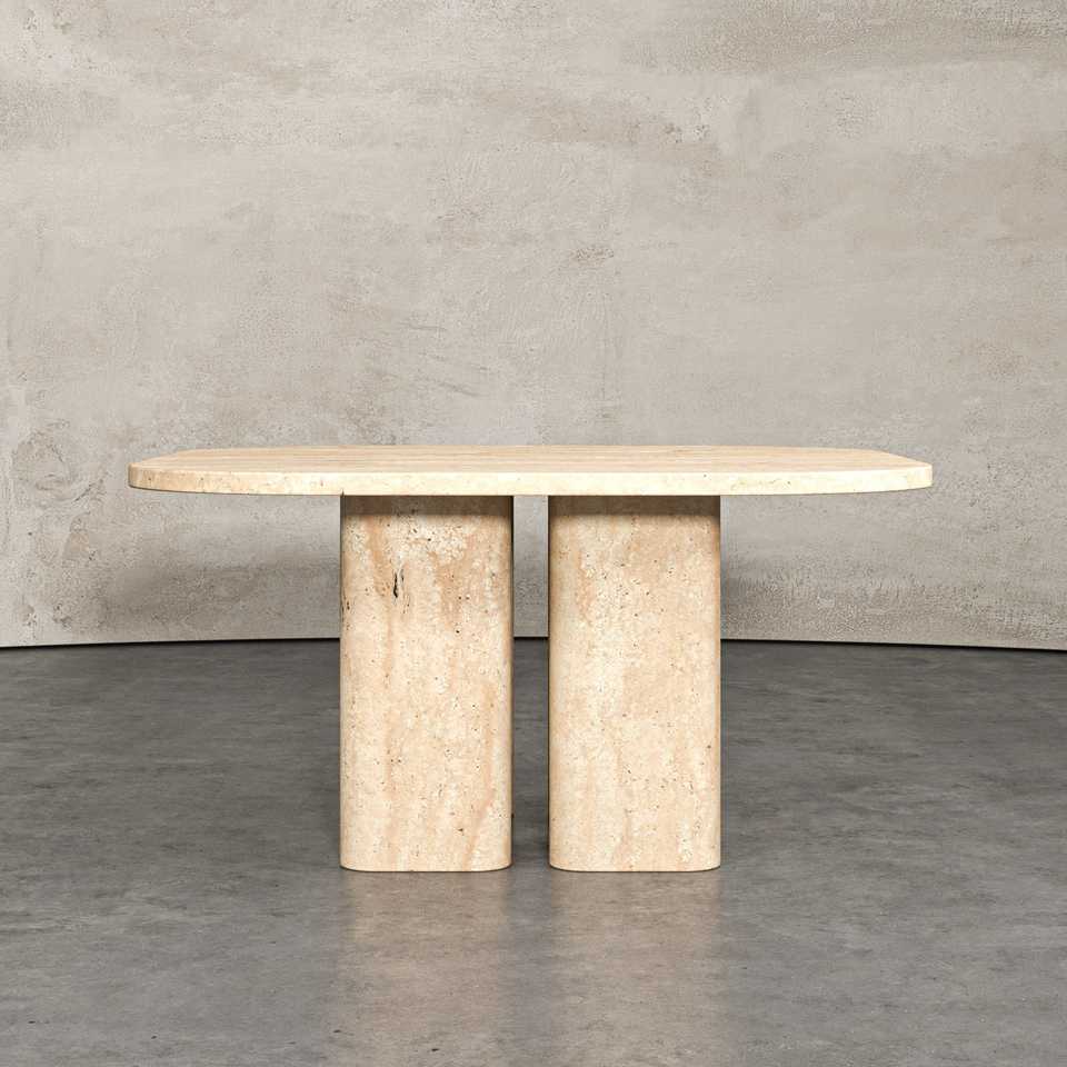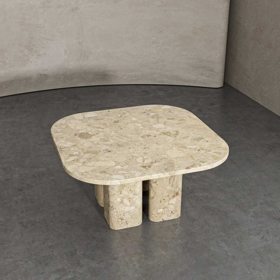 Tavolo da Pranzo in Marmo Beige Quadrato con Piano Arrotondato e Gambe Cilindriche Spesse per Ristorante e Casa