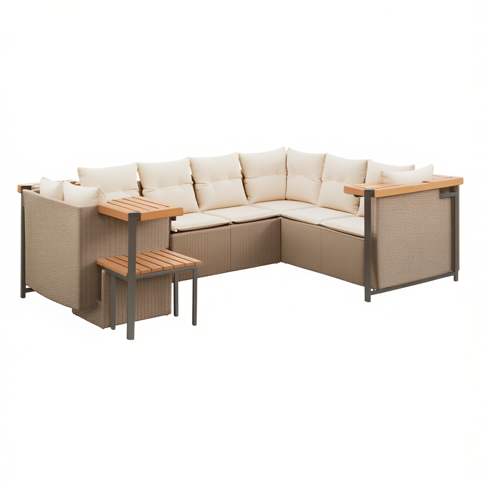 Set Divano da Giardino in Rattan PE Beige con Telaio in Acciaio e Legno di Acacia, Arredamento da Esterno dal Design Contemporaneo, 6 Posti
