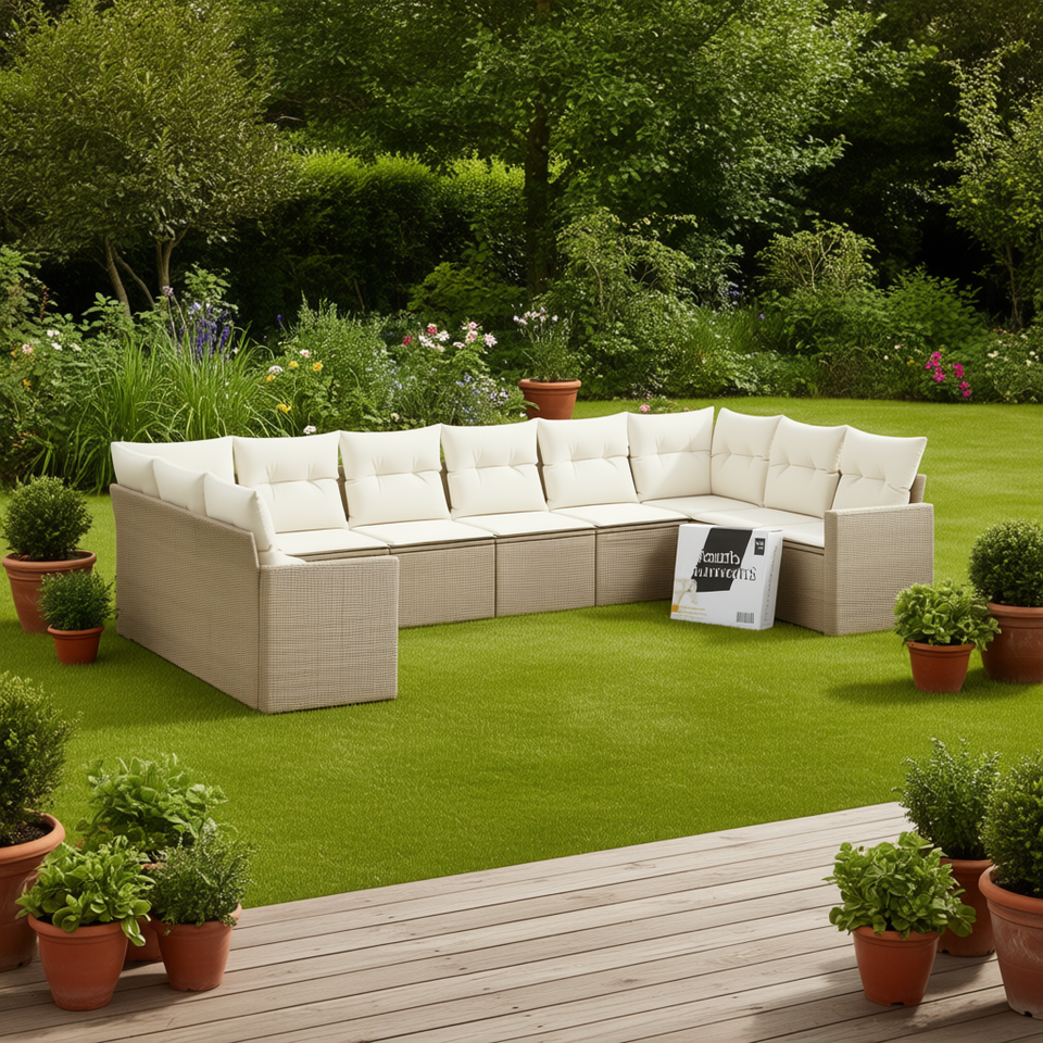 Set Divano da Giardino in Rattan Beige con Cuscini in Schiuma ad Alta Densità, Arredamento da Esterno dal Design Contemporaneo, Impermeabile e Resistente ai Raggi UV