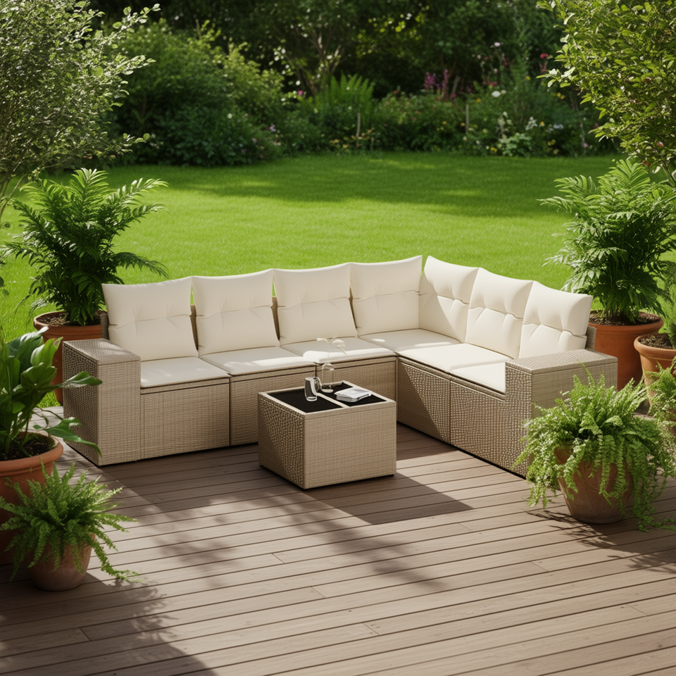 Set Divano da Esterno in Rattan Beige a 6 Posti, Arredamento da Giardino Contemporaneo in Vimini con Tavolino