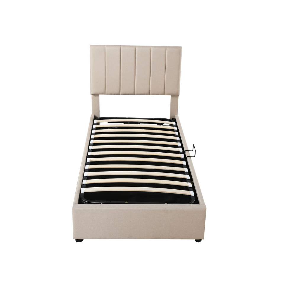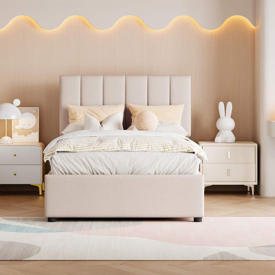 Letto matrimoniale imbottito beige con piattaforma e sistema di stoccaggio idraulico
