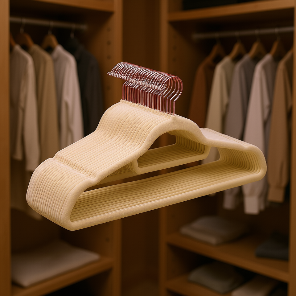 Confezione da 140 Appendiabiti in Velluto Beige Antiscivolo con Gancio Cromato e Spalle Dentellate, Robusti per Armadio