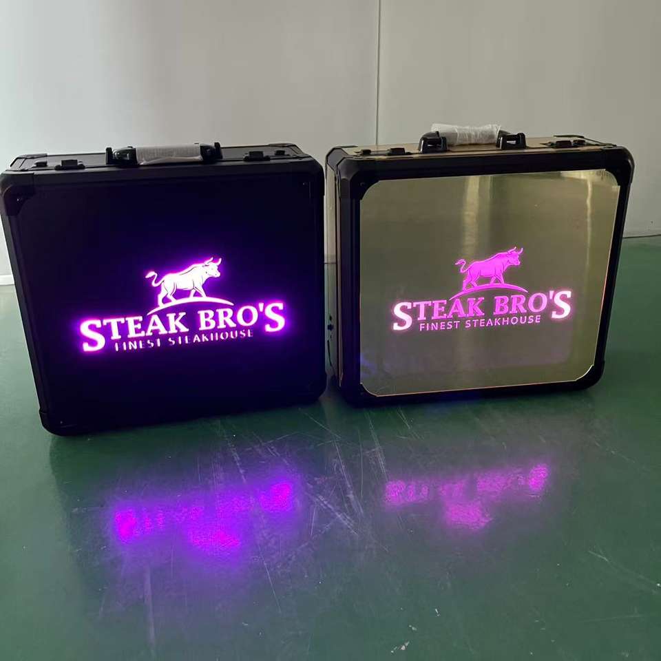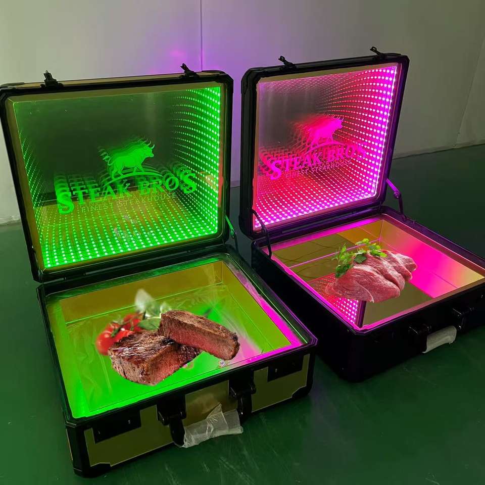 Bespoke Restaurant Hotel Bar Steakhouse Gold Mirror Beef Suitcase Meat Carrier Box LED Steak Briefcase Glorifier Display Case