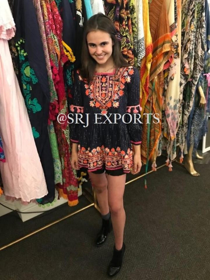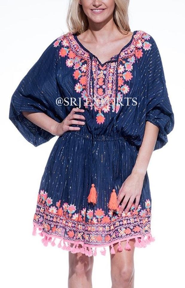 Best Online Seller Women's Kaftan Style Dress Tunic Elasticized Waistband Tassel Neck Bright Aari Embroidery Lace Mini Dress