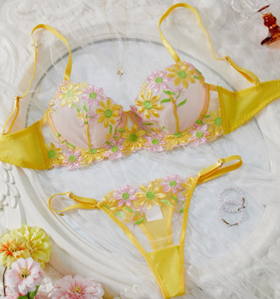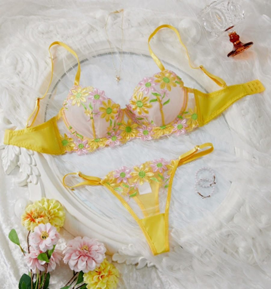 Reggiseno sottile con ricamo a fiori di Lingerie giallo chiaro di successo per ragazze reggiseno trasparente a tre punti raccolto Set di Lingerie erotica