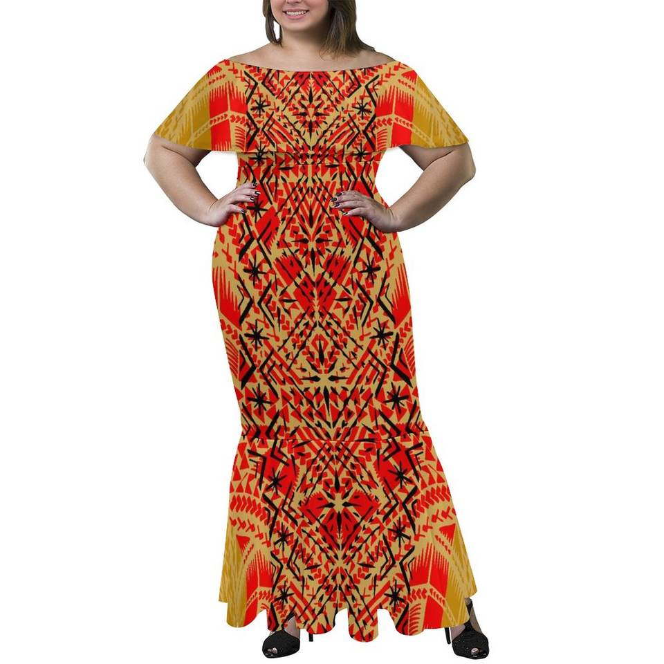 Best Selling Women's Big Size 8XL Milk Silk Sexy Off Shoulder Dress Pacific Island Art Custom Image One Shoulder Fishtail Dress