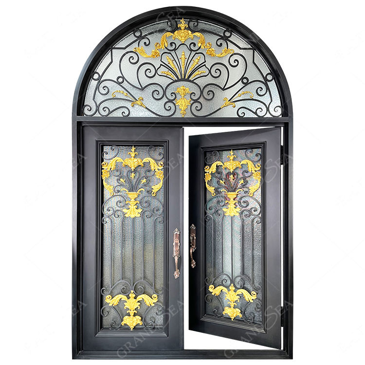 Il miglior cancello per porta in ferro battuto antiruggine esterno ad arco superiore con vetro artistico per la porta d'ingresso della Villa