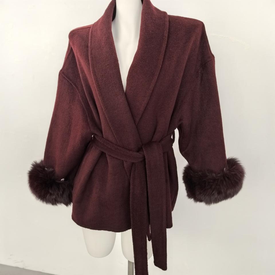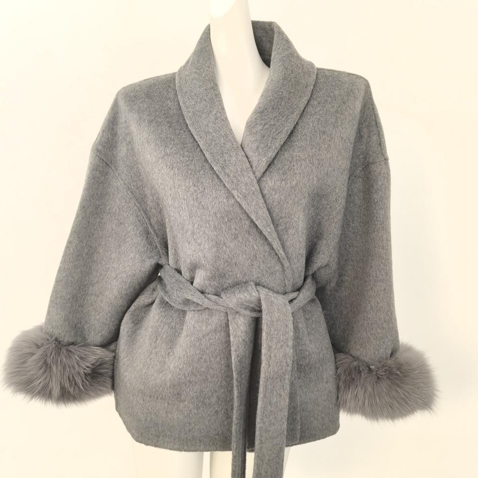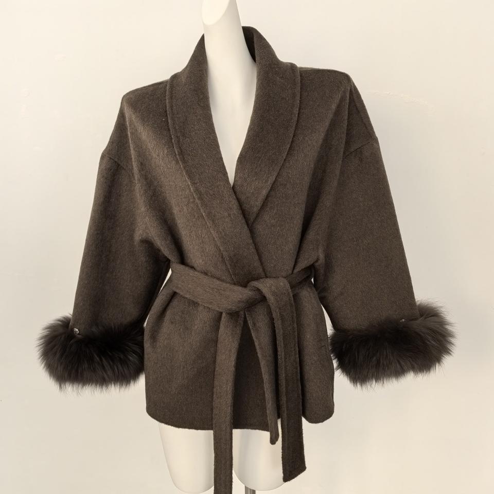 Bestseller Women's Double-Faced Trench Coat Genuine Fox Fur Cuff Belted Cashmere Blend Short Wool Jacket